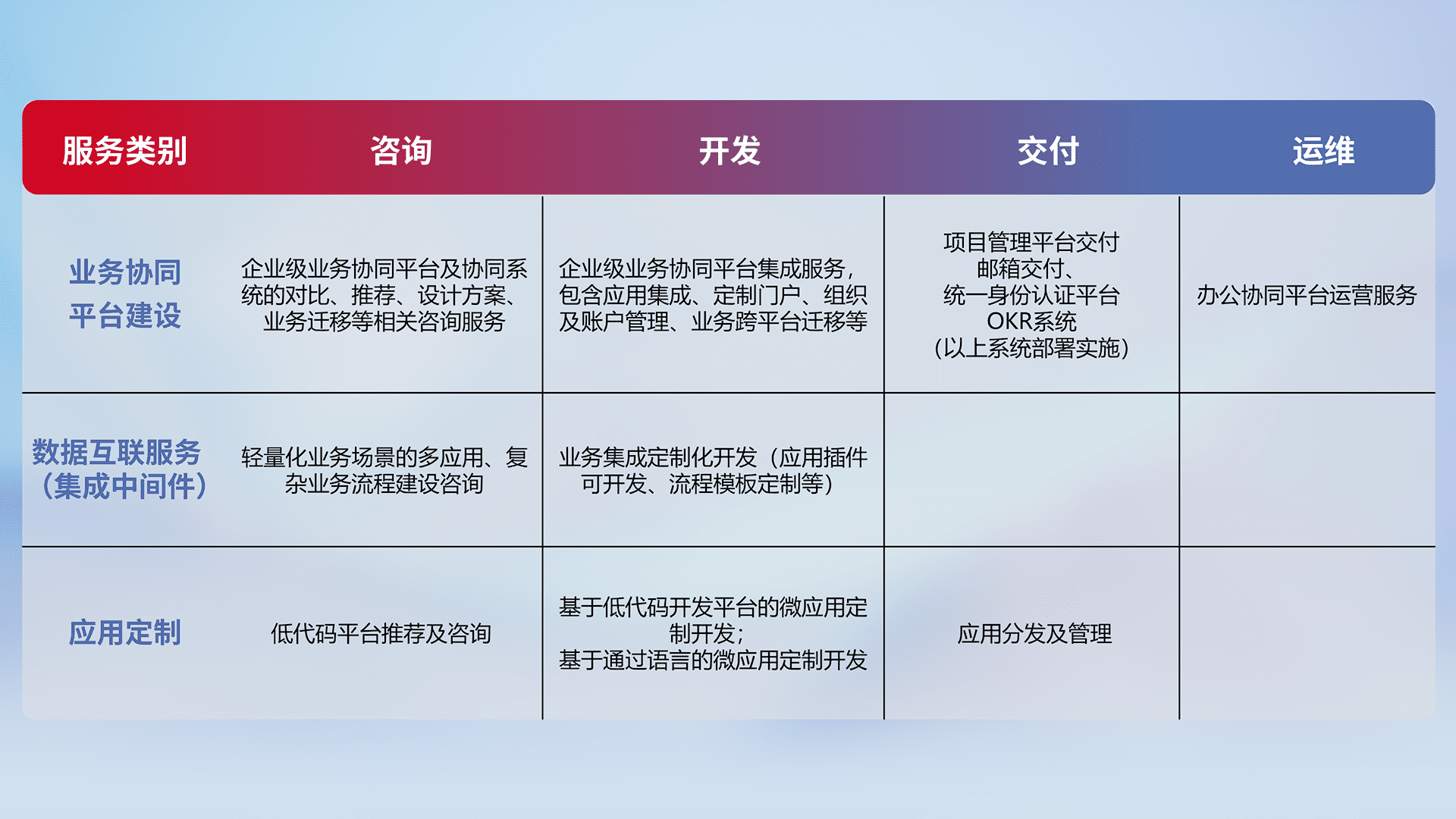 针对钉钉、、、、企微、、、IDaas等平台级产品提供产品的规划、、、、方案、、、交付、、、定制化开发等服务,,实现如统一协同办公、、智能客户服务、、混合会议管理、、、智能数据查询、、、、等业务场景,,实现数字化转型。。。。