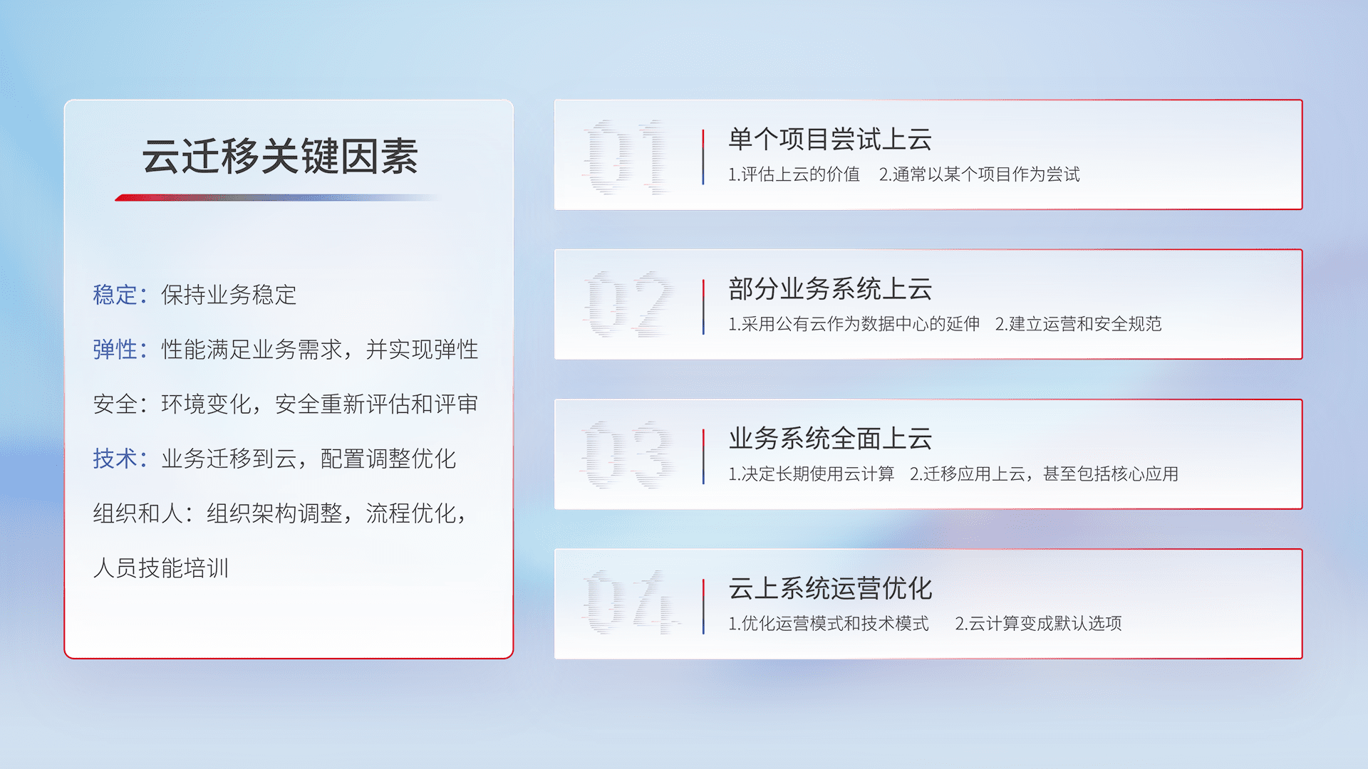 结合实际业务,,从规划设计、、云平台选型、、、、云原生改造、、数据迁移、、、集成交付,,,迁移全过程为客户识别最佳上云路径,,,,做好风险识别管理,,,设计网络架构、、身份权限、、安全审计合规、、、操作审计、、、、日志审计、、、、监控告警策略、、、多站点容灾设计等,,对云上基础设施进行整体规划,,提升IT治理水平,,,以满足弹性、、高可用、、、高性能的需求。。。。