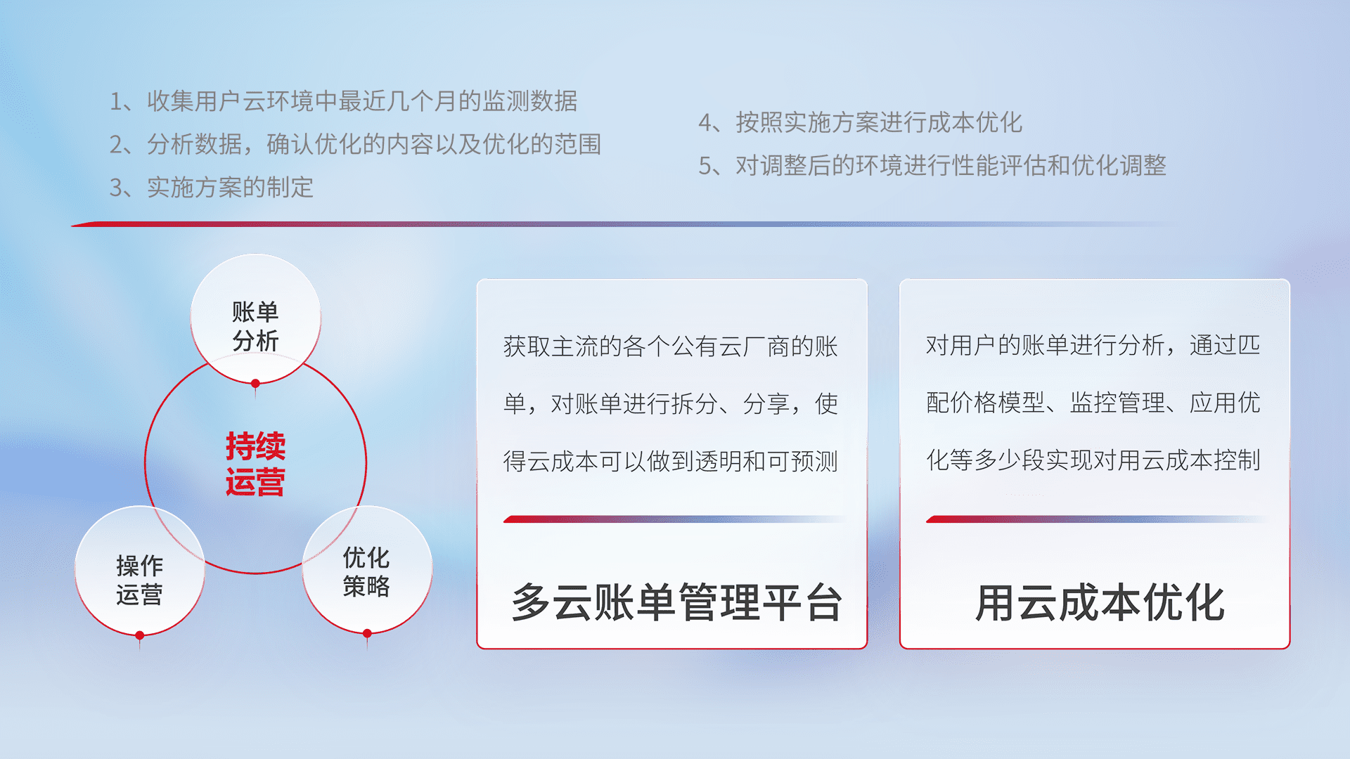 通过多云纳管,,以统一的资源数据模型把客户的云资源进行抽象和封装,,,,进而实现对多云资源的统一操作,,保障云资源管理的可靠性、、、稳定性与可用性。。。。量身定制化运维内容,,配置、、开发运维、、补丁管理、、备份、、、、监控、、、认证和访问管理、、审计和日常巡检等,,,保障在用云过程中的可靠度,,稳定度以及高可用率。。